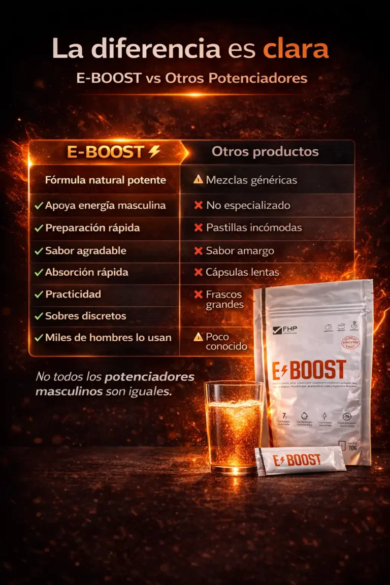 Porque E-BOOST no es un químico de efecto momentáneo, sino una fórmula completa que recupera tu energía, deseo y rendimiento desde dentro. Mientras otros productos sólo estimulan temporalmente, E-BOOST fortalece tu cuerpo, mejora tu circulación y potencia tu confianza día tras día.
